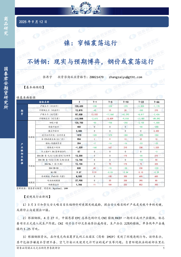 【国泰君安期货】【202509】镍:窄幅震荡运行 不锈钢:现实与预期博弈,钢价或震荡运行-3页