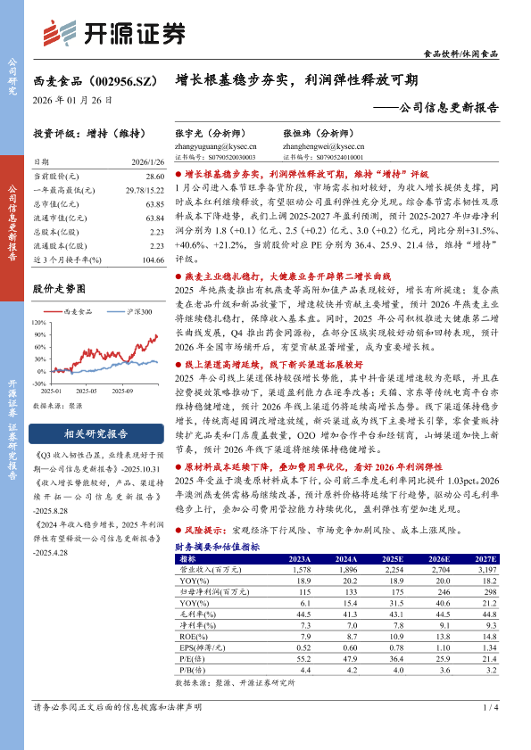 燕麦食品 大健康业务 利润弹性 渠道拓展 成本下降