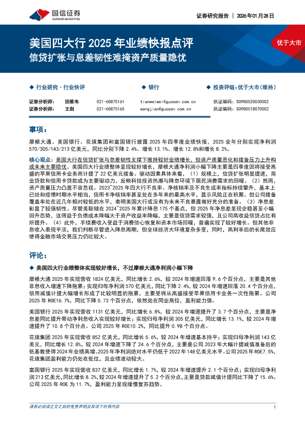 【国信证券】【202601】美国四大行2025年业绩快报点评-信贷扩张与息差韧性难掩资产质量隐忧-9页