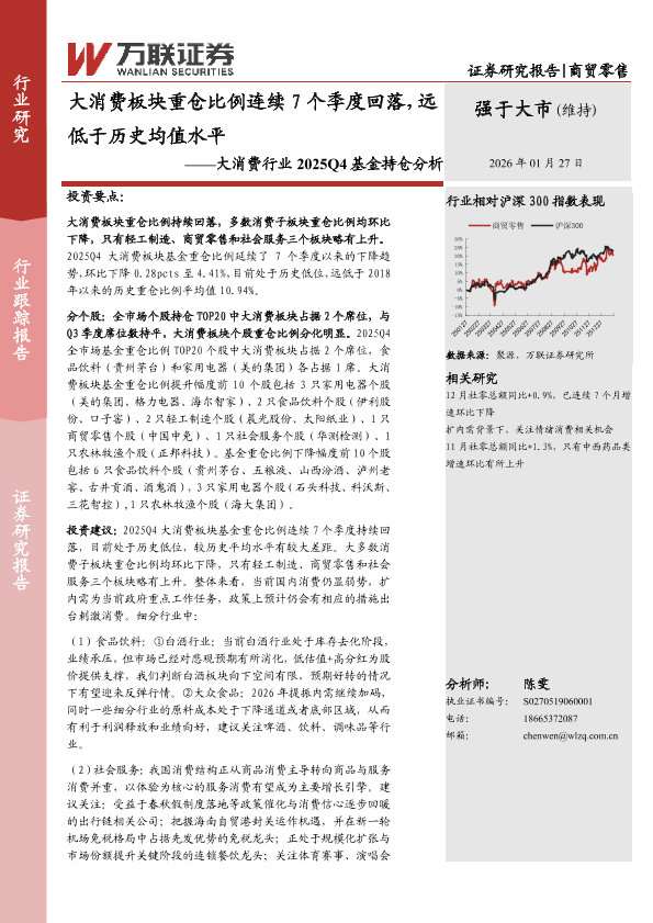 【万联证券】【202601】大消费板块重仓比例连续 7个季度回落,远 低于历史均值水平-10页