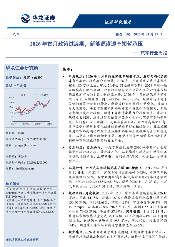 【华龙证券】【202601】2026年首月政策过渡期,新能源渗透率短暂承压——汽车行业周报-21页