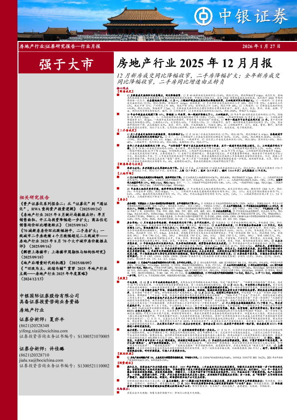 【中银证券】【202512】房地产行业2025年12月月报:12月新房成交同比降幅收窄、二手房降幅扩大;全年新房成交同比降幅收窄、二手房同比增速由正转负-36页