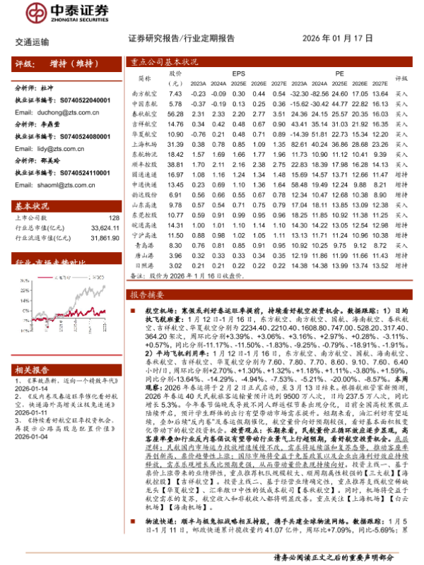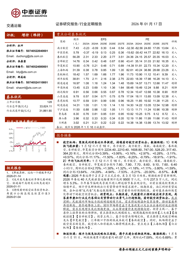 【中泰证券】【202601】交通运输行业:快递物流整合加速强者或更强,航空旺季将至量价表现可期-25页