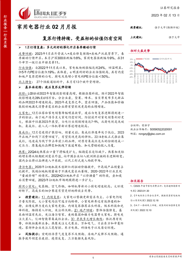 【国联证券】【20230213】家用电器行业02月月报:复苏行情持续,受益标的估值仍有空间-23页