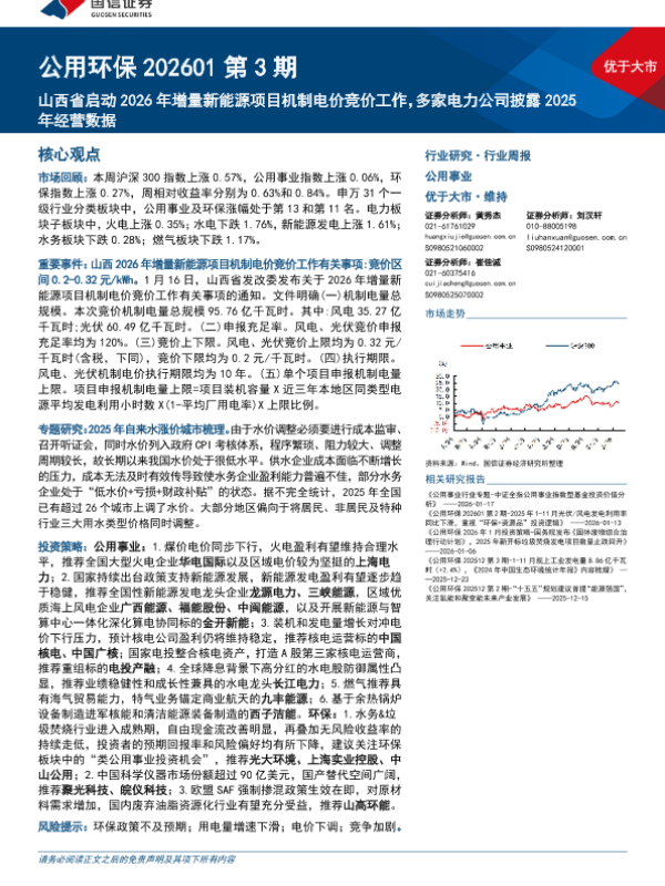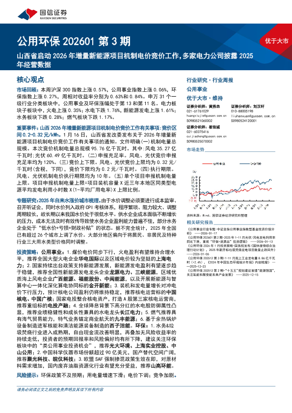 【国信证券】【202601】公用环保行业202601第3期:山西省启动2026年增量新能源项目机制电价竞价工作,多家电力公司披露2025年经营数据-33页