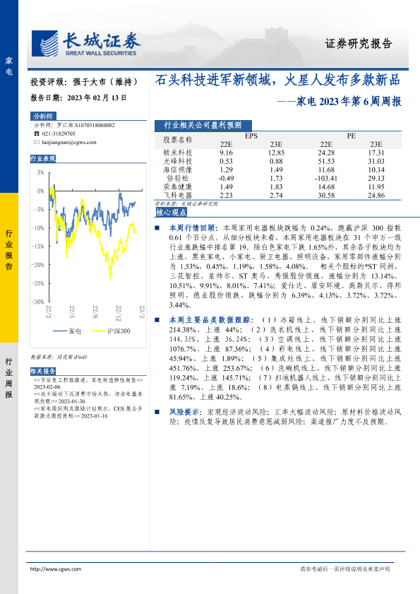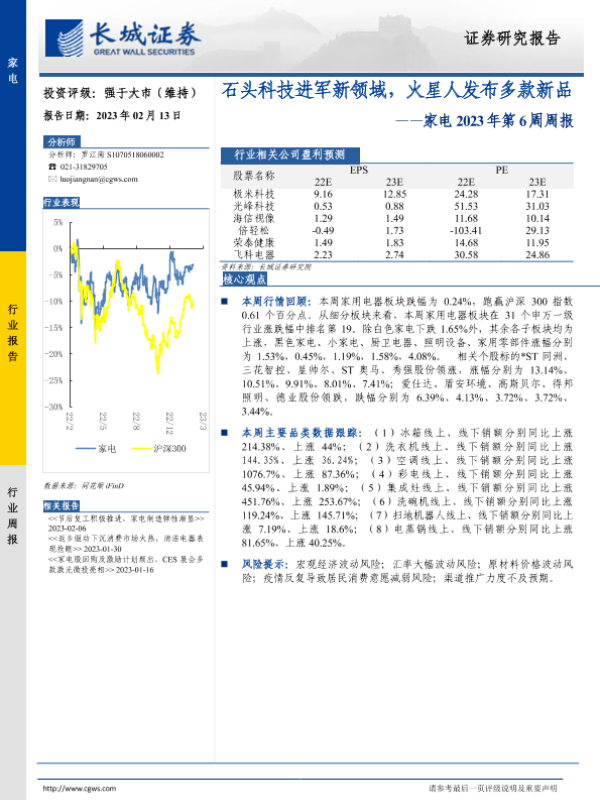 【长城证券】【20230213】家电2023年第6周周报:石头科技进军新领域,火星人发布多款新品-30页