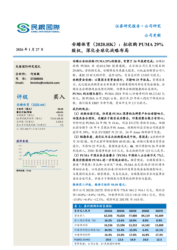 【民银国际研究团队】【202601】安踏体育(2020.HK):拟收购 PUMA 29% 股权,深化全球化战略布局-6页