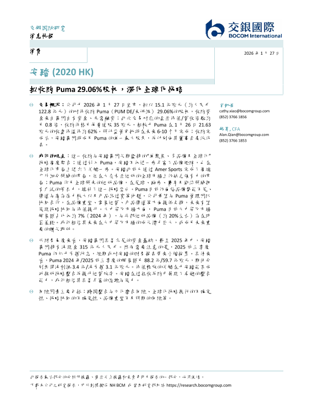 【交银国际】【202601】拟收购 Puma 29.06%股权,深化全球化战略-5页