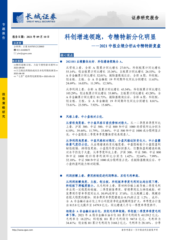 【长城证券】【20210910】2021中报业绩分析&专精特新复盘:科创增速领跑,专精特新分化明显-25页