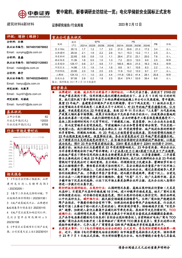 【中泰证券】【20230212】建筑材料&新材料行业周报:管中窥豹,新春调研走访结论一览;电化学储能安全国标正式发布-27页