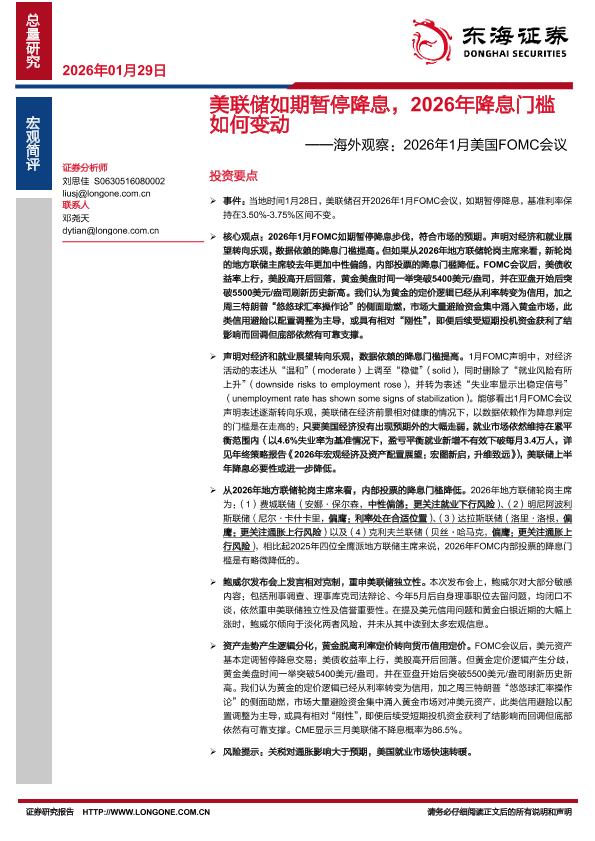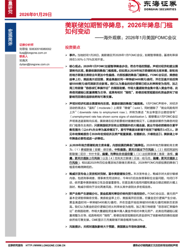 【东海证券】【202601】美联储如期暂停降息,2026年降息门槛如何变动——海外观察:2026年1月美国FOMC会议-3页