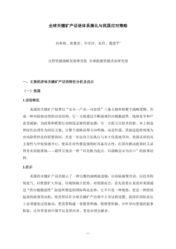 【自然资源战略发展研究院全球能源资源话语研究部】【2026】全球关键矿产话语体系演化与我国应对策略-15页