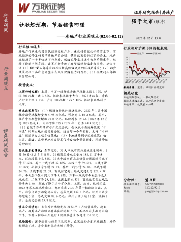 【万联证券】【20230213】房地产行业周观点:社融超预期,节后销售回暖-23页