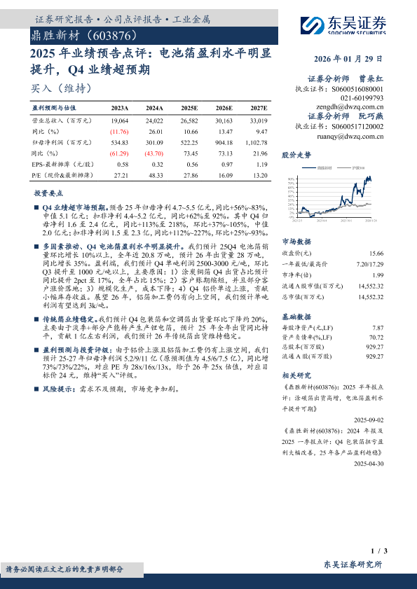 【东吴证券】【202601】2025年业绩预告点评:电池箔盈利水平明显提升,Q4业绩超预期-3页
