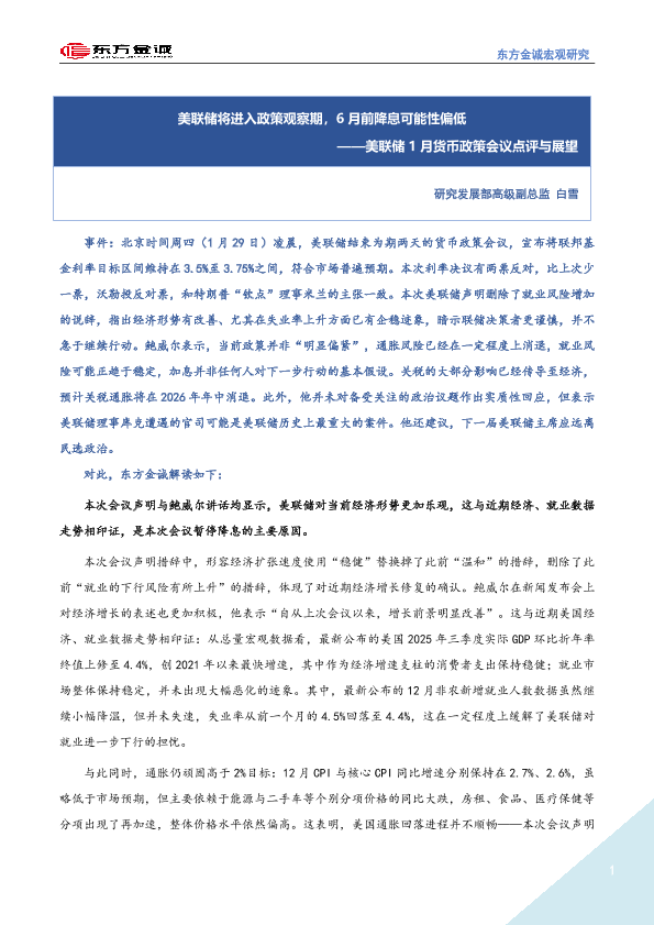 【东方金诚】【202501】美联储1月货币政策会议点评与展望:美联储将进入政策观察期,6月前降息可能性偏低-3页