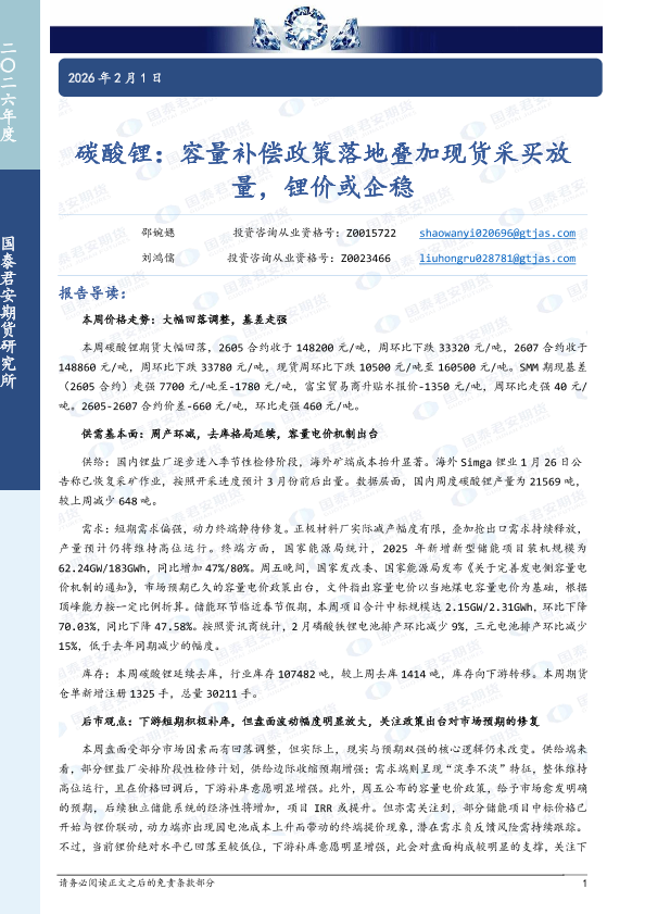 【国泰君安期货】【202602】碳酸锂:容量补偿政策落地叠加现货采买放量,锂价或企稳-9页
