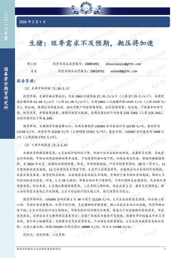 【国泰君安期货】【202602】生猪:旺季需求不及预期,抛压将加速-7页