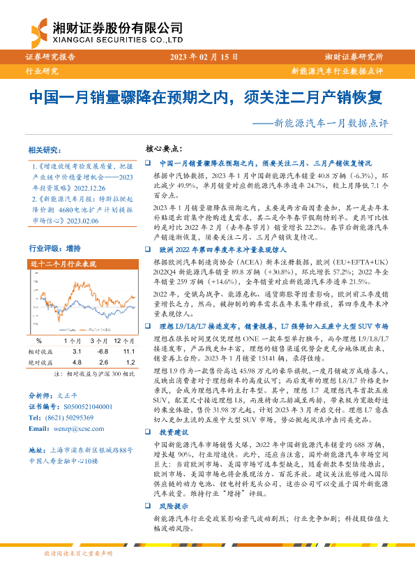 【湘财证券】【20230215】新能源汽车行业一月数据点评:中国一月销量骤降在预期之内,须关注二月产销恢复-17页