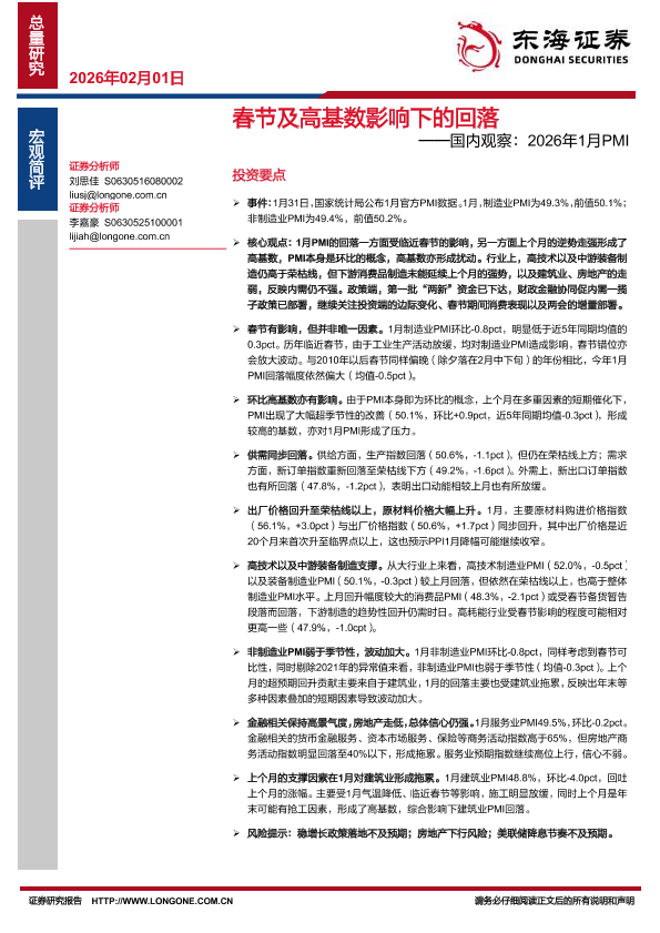 【东海证券】【202602】春节及高基数影响下的回落——国内观察:2026年1月PMI-4页