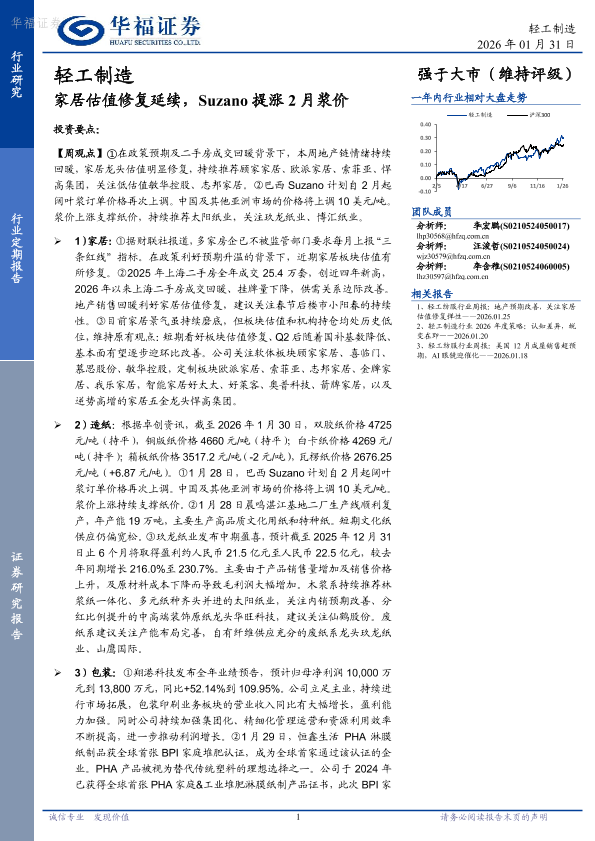 【华福证券】【202601】家居估值修复延续,Suzano提涨2月浆价-20页