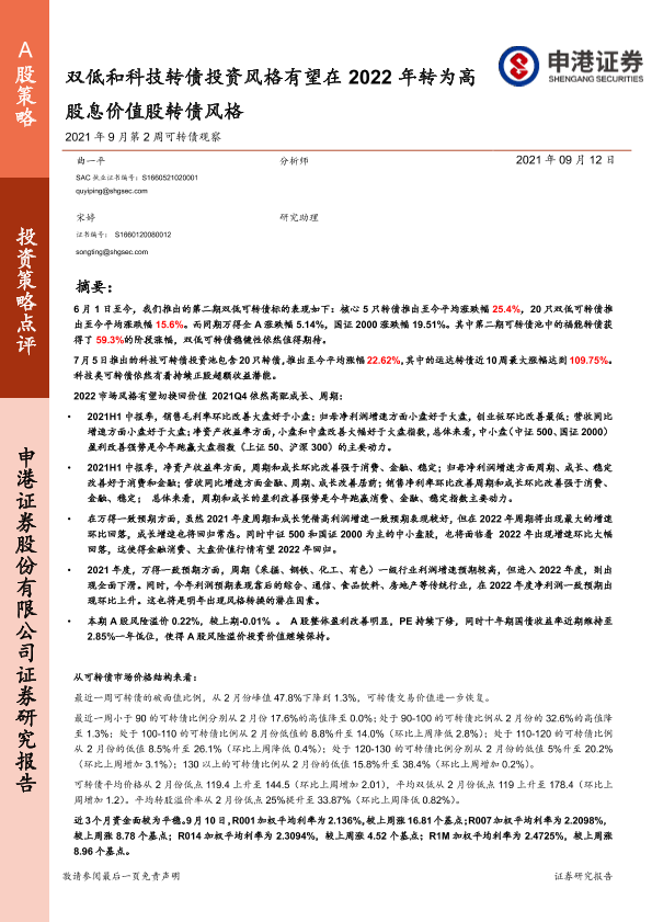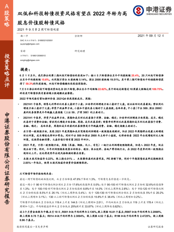 【申港证券】【20210912】2021年9月第2周可转债观察:双低和科技转债投资风格有望在2022年转为高股息价值股转债风格-30页