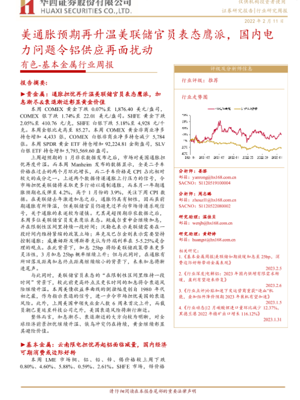 【华西证券】【20230211】有色-基本金属行业周报:美通胀预期再升温美联储官员表态鹰派,国内电力问题令铝供应再面扰动-22页