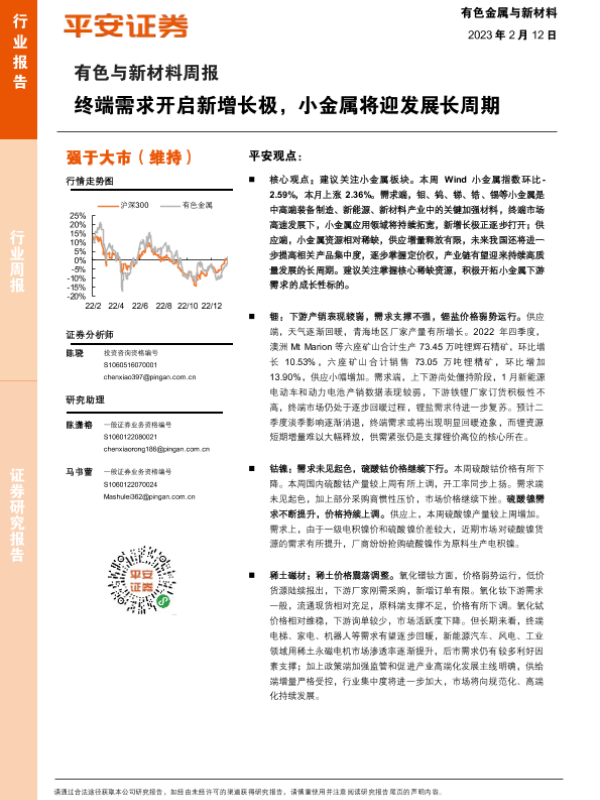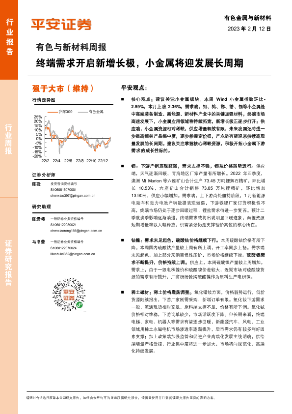 【平安证券】【20230212】有色与新材料周报:终端需求开启新增长极,小金属将迎发展长周期-16页