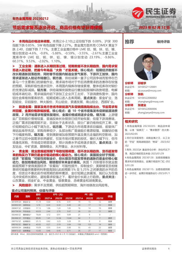 【民生证券】【20230212】有色金属周报:节后需求复苏逐步开启,商品价格有望获得提振-27页