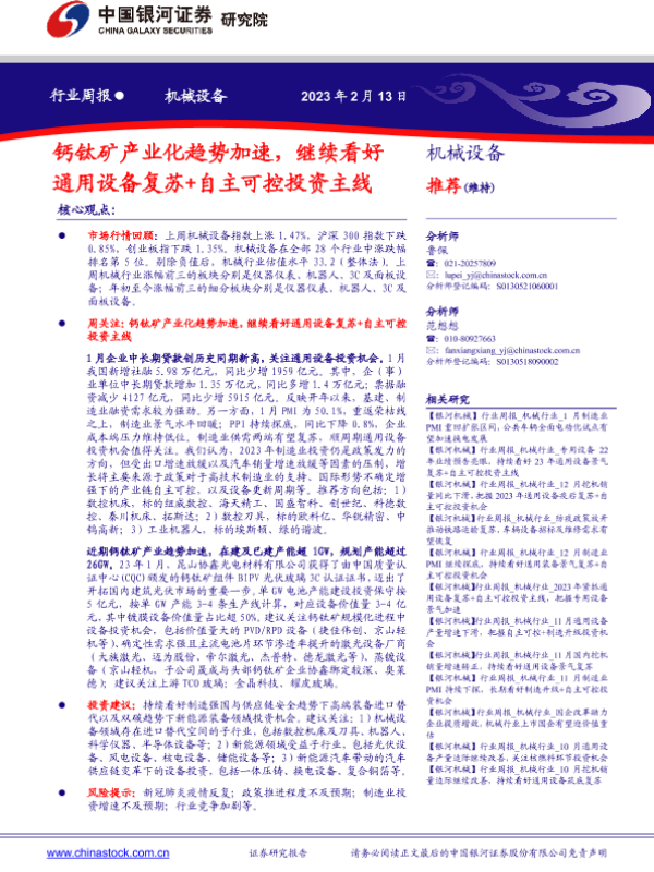 【银河证券】【20230213】机械设备行业周报:钙钛矿产业化趋势加速,继续看好通用设备复苏+自主可控投资主线-21页