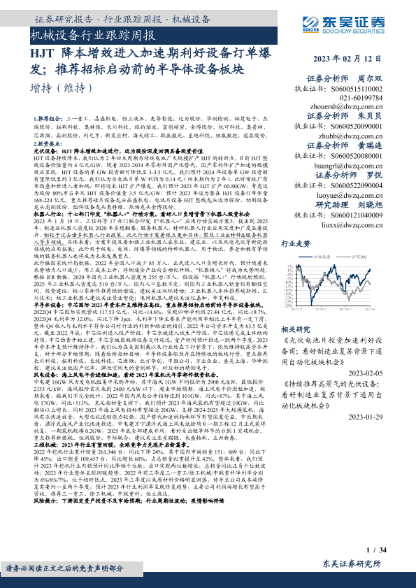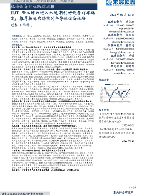 【东吴证券】【20230212】机械设备行业跟踪周报:HJT降本增效进入加速期利好设备订单爆发;推荐招标启动前的半导体设备板块-34页