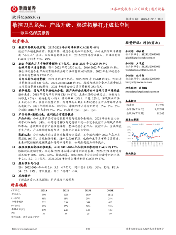 【浙商证券】【20230216】欧科亿深度报告:数控刀具龙头,产品升级、渠道拓展打开成长空间-26页