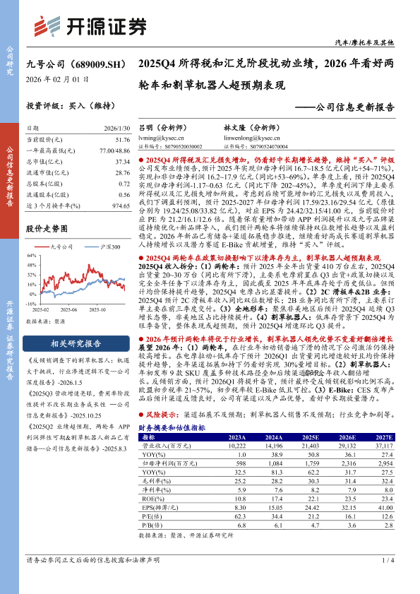 【开源证券】【202601】2025Q4所得税和汇兑阶段扰动业绩,2026年看好两轮车和割草机器人超预期表现-4页
