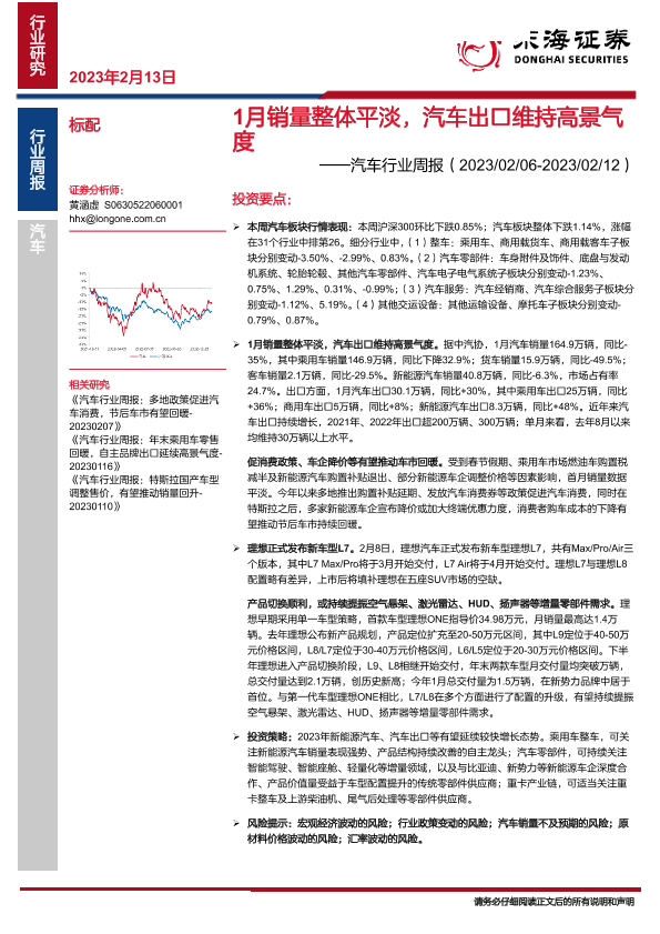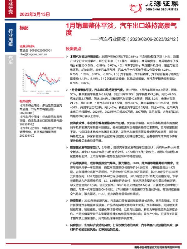 【东海证券】【20230213】汽车行业周报:1月销量整体平淡,汽车出口维持高景气度-18页