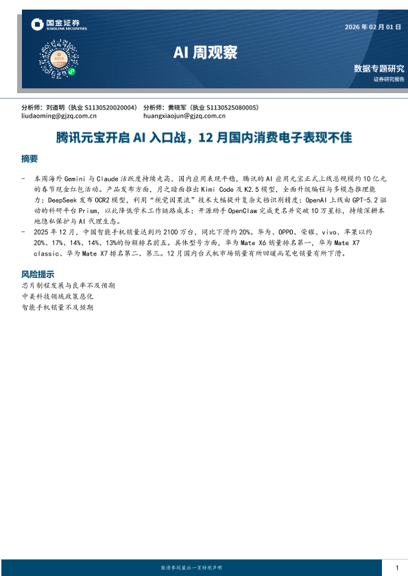 【国金证券】【202502】AI周观察:腾讯元宝开启AI入口战,12月国内消费电子表现不佳-8页