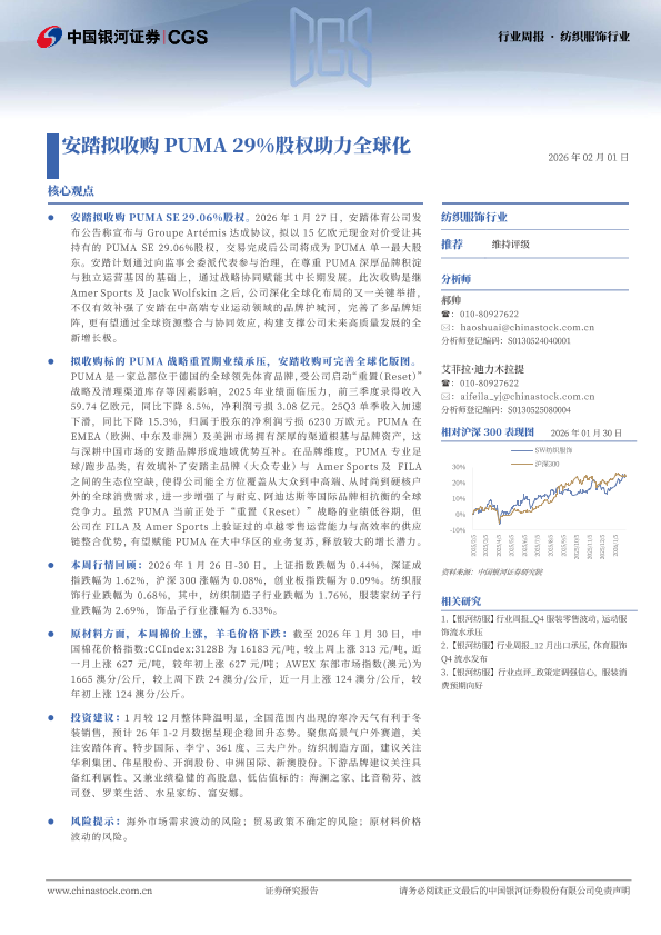 【银河证券】【202601】纺织服饰行业:安踏拟收购PUMA 29%股权助力全球化-14页