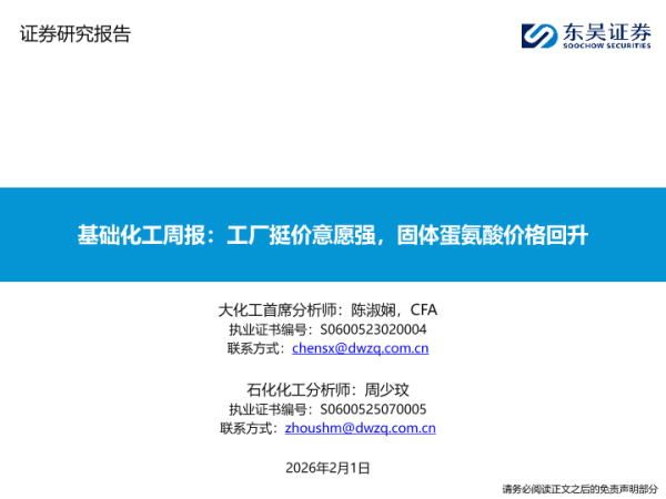 【东吴证券】【202602】基础化工周报:工厂挺价意愿强,固体蛋氨酸价格回升-20页