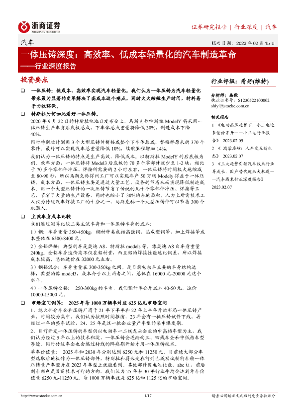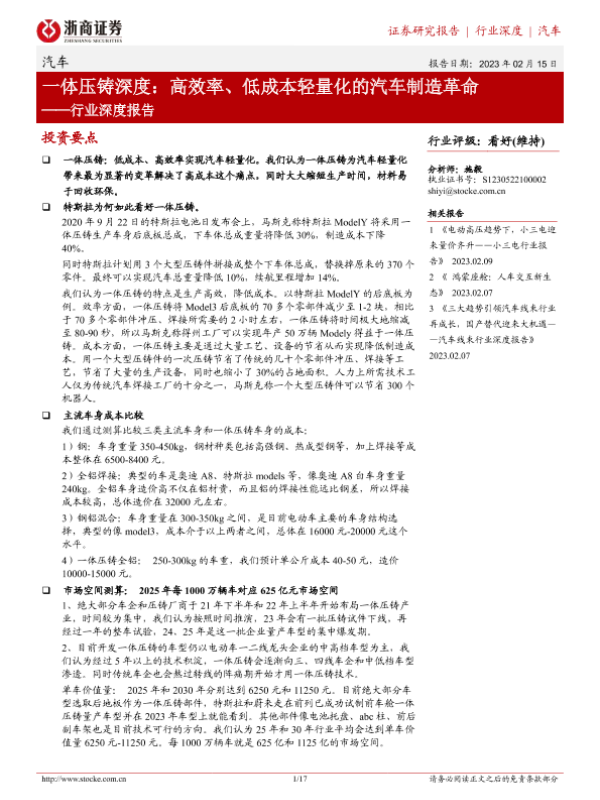 【浙商证券】【20230215】汽车行业深度报告:一体压铸深度:高效率、低成本轻量化的汽车制造革命-17页