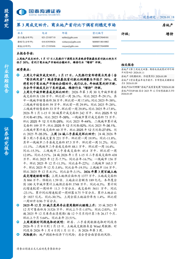 【国泰海通证券】【202601】第3周成交回升,商业地产首付比下调有利稳定市场-5页