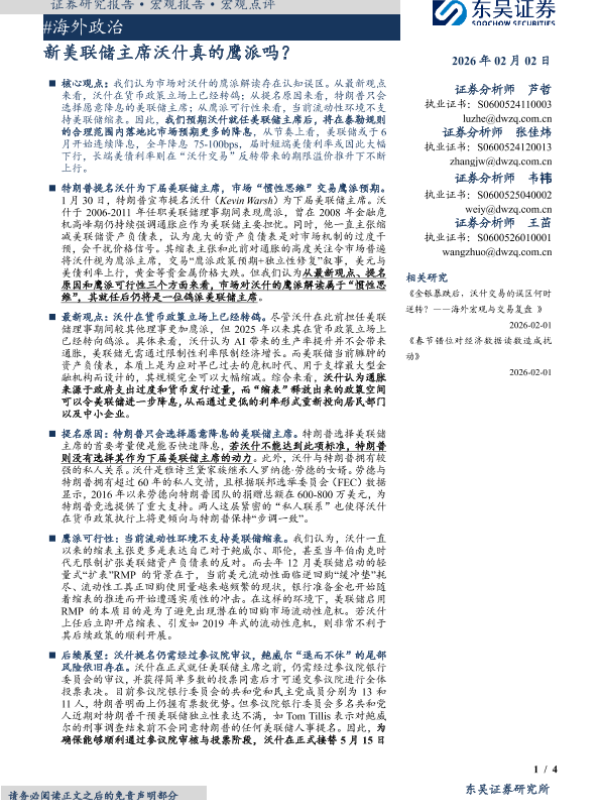 【东吴证券】【202602】#海外政治:新美联储主席沃什真的鹰派吗?-4页