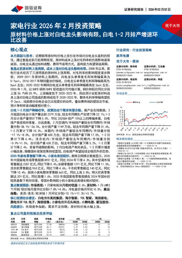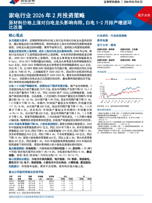 【国信证券】【202602】家电行业2026年2月投资策略:原材料价格上涨对白电龙头影响有限,白电1-2月排产增速环比改善-14页
