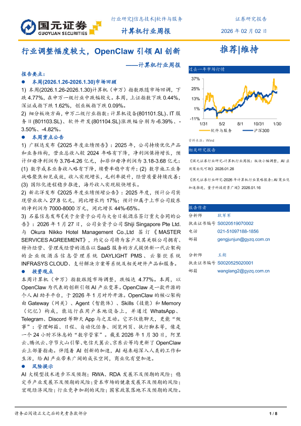 【国元证券】【202601】计算机行业周报:行业调整幅度较大,OpenClaw引领AI创新-8页