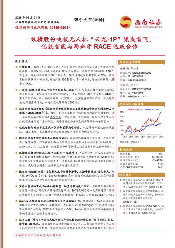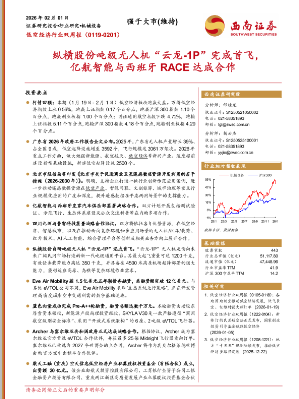 【西南证券】【202602】低空经济行业双周报:纵横股份吨级无人机“云龙-1P”完成首飞,亿航智能与西班牙RACE达成合作-13页