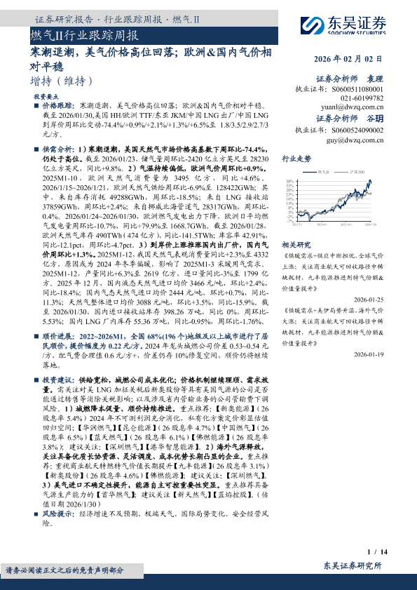 【东吴证券】【202602】燃气Ⅱ行业跟踪周报·寒潮退潮,美气价格高位回落;欧洲&国内气价相对平稳-14页