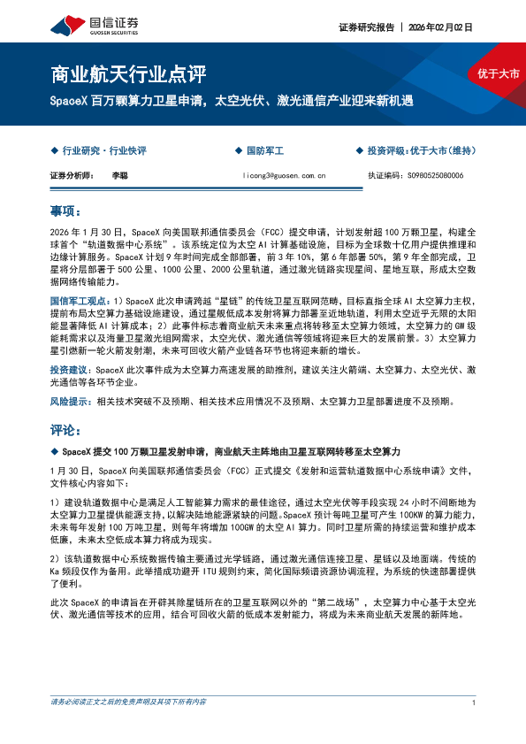 【国信证券】【202602】商业航天行业点评:SpaceX百万颗算力卫星申请,太空光伏、激光通信产业迎来新机遇-4页