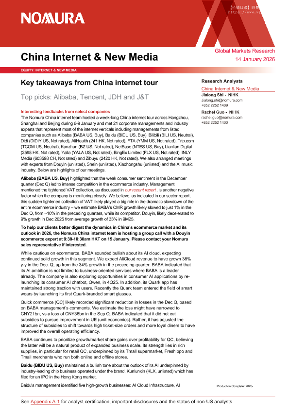 【Nomura】【202601】China Internet& New Media China互联网考察的关键要点-12页