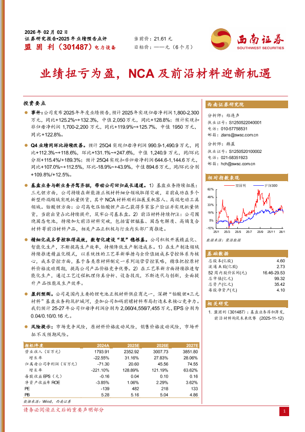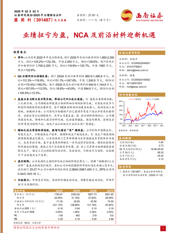 【西南证券】【2025】业绩扭亏为盈,NCA及前沿材料迎新机遇-6页