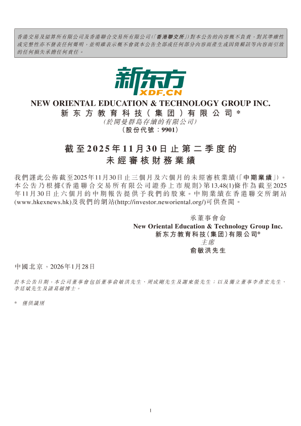 【新东方教育科技(集团)有限公司】【202601】截至2025年11月30日止第二季度的未经审核财务业绩-27页