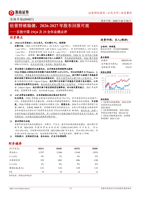 【浙商证券】【2025】经营持续稳健,2026-2027年股东回报可观——百胜中国 25Q4及 25全年业绩点评-3页