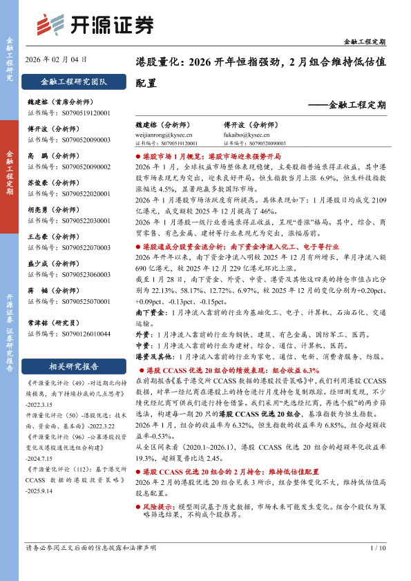 【开源证券】【202602】港股量化:2026开年恒指强劲,2月组合维持低估值配置-10页