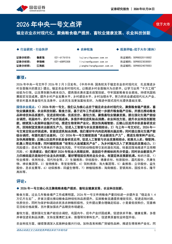 【国信证券】【202602】2026年中央一号文点评 锚定农业农村现代化,聚焦粮食稳产提质、畜牧业健康发展、农业科技创新-9页